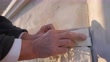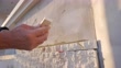 Close up video of senior construction worker gluing the stone tiles on the wall of the house.