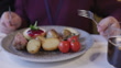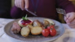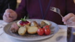 Senior man eating roasted potatoes, meat, and cherry tomatoes - 4K stock video