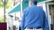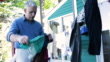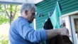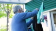 Senior Man Hanging lots of blue laundry on clothesline on windy porch in Maine