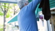 Senior Man Hanging lots of blue laundry on clothesline on windy porch in Maine - 4K stock video