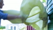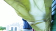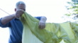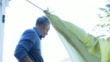 Senior man hanging up laundry outside on back porch with the wind blowing - 4K stock video