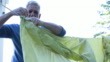 Senior man hanging up laundry outside on back porch with the wind blowing