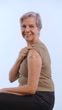Elderly woman smiling and looking at camera while showing her arm with bandage after receiving vaccine injection. Concept of prevention, trust, healthcare, senior health, immunization, protection and confidence in medical treatment.