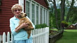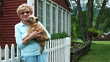 MS Senior woman standing in front of house and holding dog, smiling / Manchester, Vermont, USA. - HD stock video