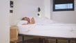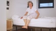 Senior woman struggling to rise from bed due to back pain in the morning - 4K stock video