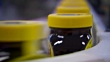 Sequence of shots showing tubs of Marmite being labelled on a factory production line