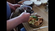 Sequence showing a man at home in his kitchen, getting his lunch ready. His food has been prepared before, and kept hot in the Yorkist oven range. He takes his plate and puts it on the kitchen table, then removes a hot pan with gravy in, and spoons out the gravy onto his plate of food. It looks like a Sunday roast dinner, with meat, vegetables and Yorkshire puddings. Behind him, his wife can be seen doing the washing up. South Yorkshire, UK; 1982 (LDFB675H/70 - AEVZ001J)