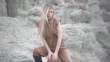 Serious Female Sitting On Brown Suitcase While Wearing Matching Bodysuit On Rocky Terrain - 4K stock video