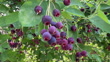 Clusters of ripe serviceberries (Amelanchier alnifolia), also known as Saskatoon berries, hang from leafy branches with deep purple skin and star-shaped calyxes.