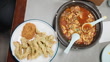 Wide shot of a traditional Chinese dish featuring spicy Mapo Tofu served alongside fried vegetables on a dining table. The vibrant red sauce of the tofu dish contrasts with the golden-brown vegetables, creating an appealing visual.