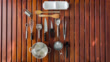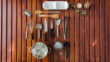 Stop motion timelapse of important kitchen utensils and cooking items displayed in a neat overhead/flat lay manner on a wooden table.