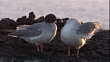 Shallowtailed gulls preen on a rocky beach. Available in HD. (Core Number: NBRY631W)