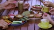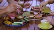 Shared vegan meal from above showing a variety of colorful dishes on a wooden table. Includes falafel, beet dip, hummus, cucumbers, green pita, and sweet potato fries. Several hands interact with the food and drinks in a lively moment. - 4K stock video