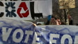 RBS shareholders vote against bank's pension and pay policy; SCOTLAND: Edinburgh:EXTRBS (Royal Bank of Scotland) shareholders arriving for annual general meeting (AGM) as handed leaflets by shareholders action group memberGeneral views of protestors outside meeting with banner reading 'We vote for a cleaner RBS', some wearing masks of Fred Goodwin and chanting SOTVox pops with shareholdersRBS Shareholders Action Group members handing out pamphlets to shareholdersClose view of RBS Shareholders Action Group leaflet about the groupShareholder into meetingINTPhilip Hampton (Chairman, RBS) interview SOTEXTDetail of various Edinburgh statues Edinburgh stairs