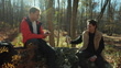 Sharing drinks in sunlit woods. Two men in their 30s enjoy autumn forest scenery - 4K stock video