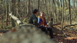 Sharing thoughts on woodland logs. Two men in their 30s converse in autumn forest setting - 4K stock video