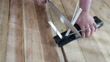 Sharpening kitchen knife. Third step. Using corner of fine ceramic stone. Alternating perpendicular strokes from heel to tip of blade. Plastic base. 2 fine ceramic stones at 40º angle. 2 aluminium safety rods. Wooden plank. High point of view.