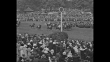 Title card: "She's Some Race, No? Auteuil - It's France's day on turf! Pres. Lebrun sees 'Duc d'Anjou', at 13 to 1, win half-million francs in Grand Steeplechase" / horses parade on racetrack at Auteuil Racecourse as spectators mill around in foreground prior to start of Grand Steeple-Chase de Paris horse race / French President Albert Lebrun and first lady Marguerite Lebrun stand in presidential box at Auteuil Racecourse / WS rear shot starting line raises, horses begin race / horses take jump, one falls but gets up / slo-mo horses approach after taking jump; two horses down / CU crowd watching with gendarme in front / horses take last jump which includes ditch of water; one horse goes down / three horses go down after clearing jump and ditch; jockey lies on ground / home stretch: Duc d'Anjou wins, ridden by Raymond Tremeau