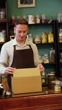 Young salesman opening a cardboard box behind the counter of a small grocery store specialized in spices