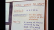 Shots showing unidentifiable male prisoners taking part in lessons. Includes over-the-shoulder view of a young prisoner writing on lined paper with a ballpoint pen, close shot of a prisoner leaning on a piece of wood that he saws during a woodworking class, and a handwritten classroom teaching aid literacy poster entitled 'USEFUL WORDS TO KNOW' explaining vowels, consonants and prefixes. UK; 1984. (BBC News BSL Rushes - 22/10/1984 - AEXZ288W)