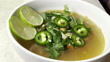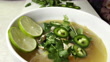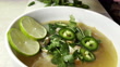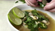 Shrimp Pho Soup With Green Onion, Mushrooms, Fresh Garlic, Bok Choy, Jalapeno, Lemon Slices And Cilantro Over Pad Thai Noodles, Video Clip