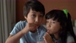 Siblings sharing a milkshake at home