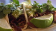 Side shot of some delicious looking street tacos filled with Carne Asada, Cilantro, Cotija Cheese and Limes. - 4K stock video