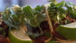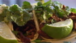 Side shot of some delicious looking street tacos filled with Carne Asada, Cilantro, Cotija Cheese and Limes. - 4K stock video