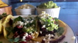 Side shot of some delicious looking street tacos filled with Carne Asada, Cilantro, Cotija Cheese and Limes.