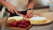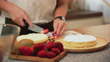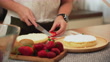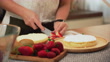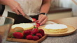 Side view of Southeast Asian human's hand with apron sliding strawberry as a piece to prepare home-made strawberry shortcake. Dessert, bakery preparation at home during working at home. - 4K stock video