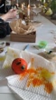 A vertical side-angle video captures a warm, communal moment at a Pysanka workshop. In the foreground rests an orange Pysanka with visible wax patterns. As the camera pans from left to right, the hands of other participants come into view—carefully working on their eggs near glowing candles. The white table is filled with dyes, styluses, paper napkins, while the soft candlelight creates a cozy, focused atmosphere. The camera finishes on a candle light and majestic floral centerpiece with narcissus, blooming branches, and green moss, enhancing the beauty and unity of the scene.