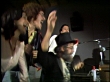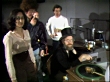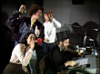 Side view, Weird Al Yankovic among a group of people dance around playing kazoos and other toy instruments as Dr Demento introduces his radio show in the studio at Westwood One radio.