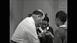 MOT 1939: DIXIE AFRICAN-AMERICAN HEALTH: MS Sign 'Colored Department.' INT WS Negro-American children sitting on bench in public health office. MS Doctor examining Black-American girl. CU Girl w/ hand out to doctor.