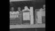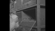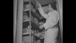 CU sign on an interior door, "Pneumococcus Typing and Pneumonia Serum Distribution, Division of Pneumonia Control, Department of Health, City of New York, Bureau of Laboratories" / two female lab techs enter and shut door / CU same sign / CU sign "603 Pneumonia Serum and Typing" / Pan up lab supply closet, female lab tech enters and picks up two bottles of liquid / VS supplies on shelves / A lab tech examines experimental rabbit hutches, opens a door, removes a white rabbit from the straw inside, and pets it / CU rabbit in tech's arms / rabbit is placed on a scale / Pan down exterior of the Department of Health Research Lab in New York City / Note: exact month/day not known