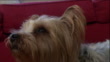 A silky terrier sits on a red sofa. - HD stock video