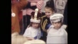 Silver Jubilee street party; ENGLAND: London: Fulham:People in street with Union Jack flag buntingDecorations with crownWoman wearing Queen costumePeople wearing Union Jack costumesBabyPeople in Union Jack costumes with police officerChildren in costumes on stageMan with drinksChildren egg and spoon raceVarious of people dancingChildren eating picnic