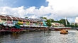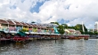 View of Singapore River / Clarke Quay with Tongkang (light wooden boat) travelling along the river for transportation and river cruise. Timelapse photography.