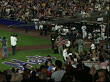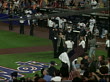 WS ZO singer Liza Minnelli performs New York, New York at seventh inning stretch, w/ NYPD, NYFD members in uniform kicking like a chorus line (partial, cuts off abruptly. First MLB baseball game (NY Mets vs. Atlanta Braves) after September 11 terrorist attacks, Shea Stadium, September 21, 2001.
