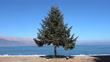 Lonely Pine tree near the coastline of Egirdir Lake. Single tree on a rocky seashore, a sunny day with blue sky, and blue sea meeting on the horizon
