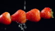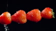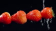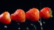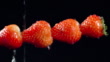 Slow Motion of Bright Red Fresh In-Season Ripe Strawberries Attached to a Spinning Fruit Skewer with Clear Rain Water Splashing Down Washing on a Black Background