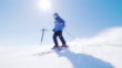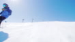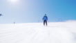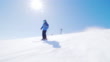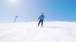 Skier skiing on slopes in winter ski center. Sun rays and lens flare visible. - 4K stock video