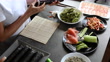 In her kitchen woman, Thai ethnicity, making traditional sushi rolls, with fresh and raw vegetables and seafood, while using a bamboo mat to roll them up