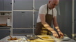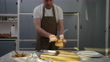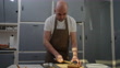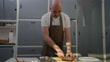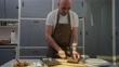 Removing aluminum foil on top of fried rump steak. Placing meat on cutting board. Slicing with meat knife. Plating sliced meat.