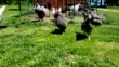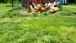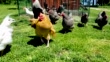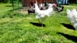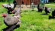 A variety of chickens running and walking in slow motion as they are released from the chicken run to free range for the afternoon. Breeds of chickens featured include Buff Orpington, Dominique, White Rock, Speckled Sussex, and Dark Brahma. A dramatic collision occurs between a Buff Orpington hen and a White Rock cockerel around 1 minute.