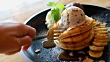 Slow motion cutting pancakes with fork and let's enjoy eating. - 4K stock video