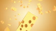 Triangular blocks of cheese fall in slow motion, showcasing their texture and richness. Defocused cheese add depth to the gradient yellow background. This animation is perfect for promoting dairy products, creative culinary presentations, or gourmet advertisements.