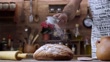 Slow motion of man hand pouring icing sugar on fresh baked sweet round bread
