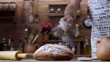 Slow motion of man hand pouring icing sugar on fresh baked sweet round bread - HD stock video