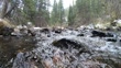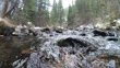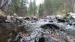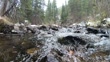 Slow-motion video captures the serene flow of water over rocks in a mountain river within Rocky Mountain National Park. Light snowflakes gently fall, adding a touch of magic to the scene. The crystal-clear water cascades gracefully, creating a soothing ambiance as it meanders through the rugged terrain. In the background, a forest of vibrant green fir trees enhances the natural beauty of the landscape, perfectly complementing the tranquility of the flowing river. This intimate close-up shot immerses viewers in the peaceful and pristine environment of the Rockies.