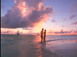 Slow motion REAR VIEW couple with swimsuits walking along ocean surf + kissing at sunset / Virgin Islands - stock video